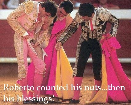 Roberto worked the bull closer to him in, teasing it in with a series of moves. Diablo stood barely six feet from the novice matador. Roberto faced the animal and locked his eyes on those of the bull. Slowly, he inched his way toward the exhausted, but still enraged animal. He stopped within arms reach, never allowing his gaze to waver from Diablo's eyes. One hand eased out toward the massive beast, as silence descended on the arena. The fingers wrapped around the end of the lethal weapon on the bull's head, clasping the horn and holding it for a slow count of three. He had done it. He had succeeded in taking the bull by the horn.