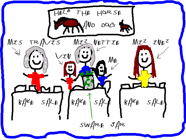 Vin was excited. Not only would he get to have the bake sale, he got to go to work with Chris. AND he didn't have to go to school! Except he did have to write a paper about why they were having the sale. Chris had called the school to tell them why they weren't coming in. That's when Mr. Beidler had given them the assignment.