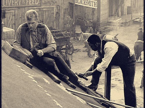 Chris stretched his legs and crossed his ankles, settling for a long story, his eyes back on the street. He let Buck's words wash over him, so familiar in their rhythm and tone they were soothing, almost. The words became a background noise when he shifted his attention to Josiah and Nathan, walking toward Nathan's clinic. Nathan was cradling one hand in the other, looking angry, while Josiah wore a huge, toothy grin. Yosemite exited the livery with a glowing piece of metal held by a long tong, and answered Josiah's wave with a nod. Soon he was hammering the iron on his anvil just outside the huge double doors. A few of the town children gathered around to watch, the Potter kids among them.
