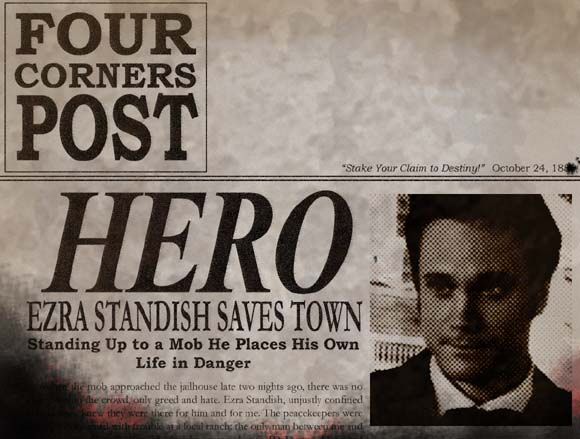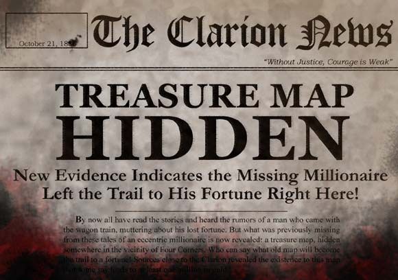 "What the-! How-? I-I-I . . ." Standish gaped, for once it seemed unable to find words fit to express the travesty of the Clarion's follow story. The paper slipped from his fingers and collapsed on the floor. Bold font exclaimed the incendiary words: "Treasure Map Hidden in Four Corners!" Chris leaned forward for a better view of the article's header, but Ezra had already snatched it back up off the floor and was reading the story silently.